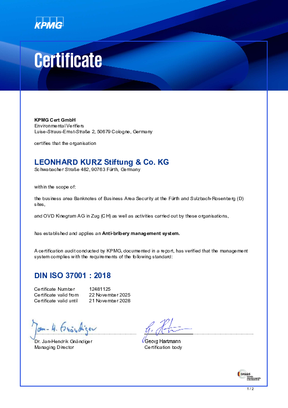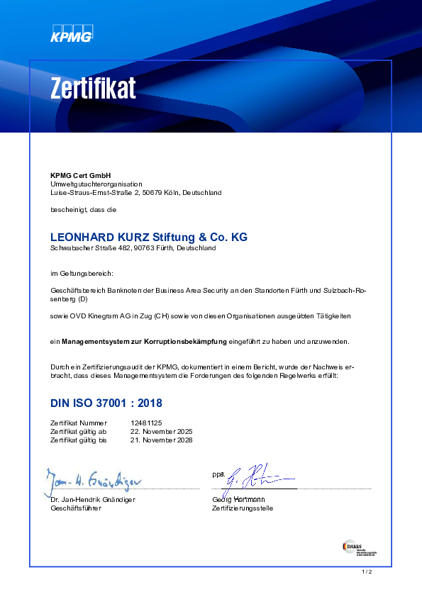 OVD Kinegram is INTERGRAF certified for high security printing, i.e. holding thei INTERGRAF organization standard WA 15374:2024 for its security management system. At the same time, OVD Kinegram has been and continues to be certified according to ISO 9001 standard for its quality management system, ISO 14001 standard for its environmental management system and ISO 14298 standard for its management of security printing processes. Together with its parent company Leonhard KURZ, OVD Kinegram is also central bank accredited for the production of high security features for banknotes.